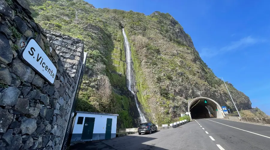 Cascata Agua D’Alto Mappa (Prima di arrivare alla cascata, proseguite per questa strada e troverete il lungomare di São Vicente con diversi ristoranti per pranzo o cena (Di sera è molto bello perchè c’è molta vita essendoci molti Ristoranti) – (Proseguendo poi per la strada dove si trova la cascata, imboccando il tunnel e successivamente appena possibile fare inversione di marcia per tornare alla cascata, potete fare il video poco prima della fine del tunnel che finisce dalla cascata per riprendere le montagne di São Vicente e l’Oceano con una Vista Spettacolare)